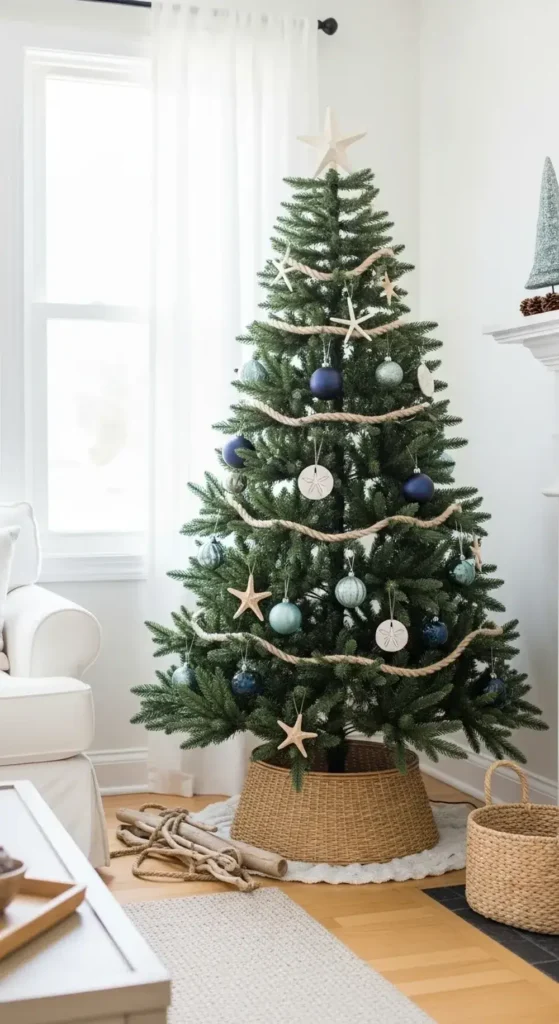 Instead of traditional ornaments, think about using starfish or sand dollar shapes. You can wrap a simple rope garland around the tree.