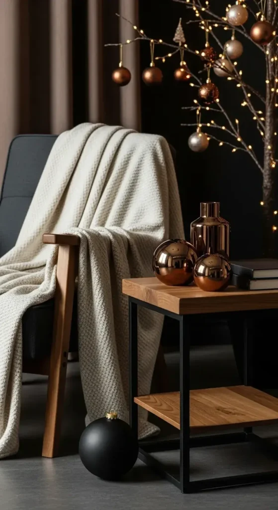 For a strong and stylish look, mix the warm metal of bronze with soft cream and sharp black. Bronze ornaments add a deep, warm glow. Cream-colored textiles like stockings and tree skirts keep it feeling soft.