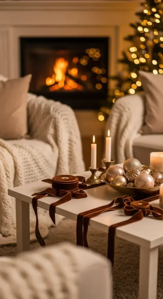 I suggest focusing on cozy fabrics. Think brown velvet ribbons, cream-colored knit blankets, and beige pillows. Then, sprinkle in just enough gold with ornaments and candle holders to make it shimmer and feel festive.