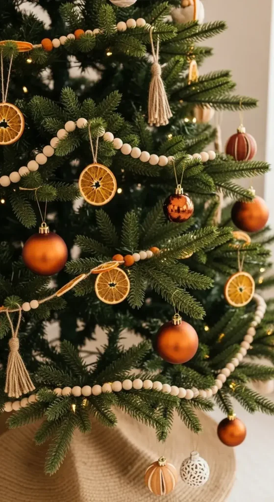 Bring some warm, earthy tones into your holiday decor. Think terracotta-colored ornaments and dried orange slices on the tree.
