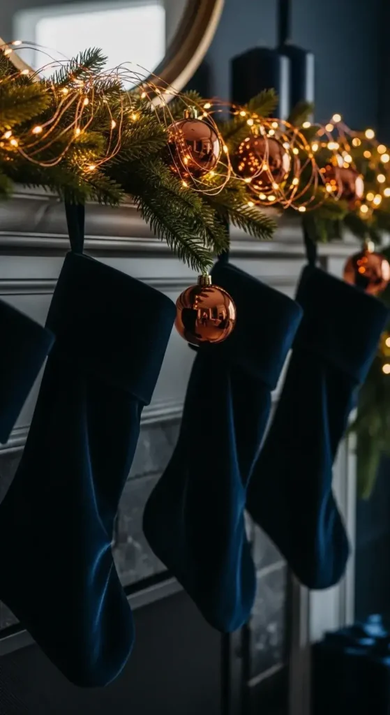For a look that feels rich and cozy, try deep navy blue and copper. Imagine velvet navy stockings hanging from a mantel decorated with copper fairy lights.