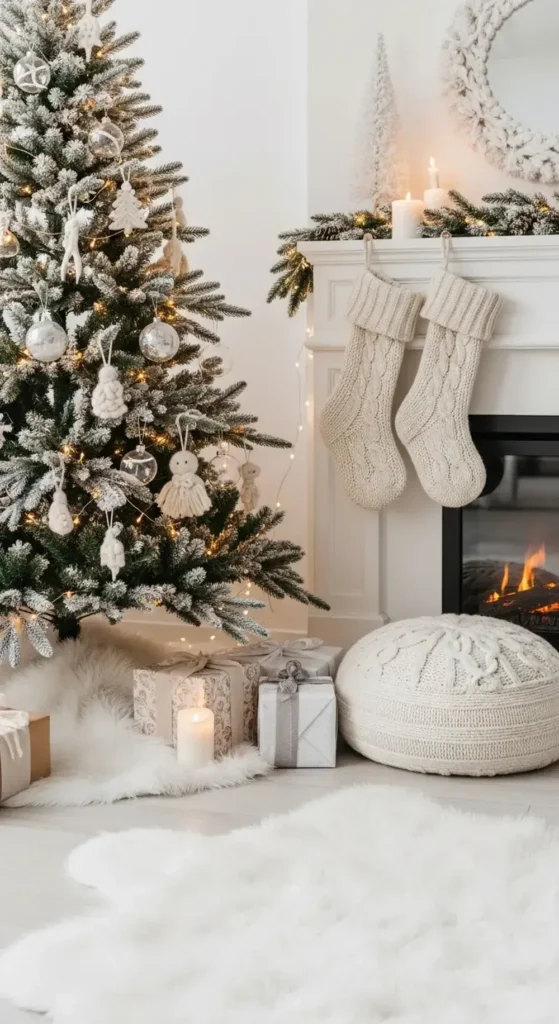 A fluffy white tree skirt and cream-colored wool stockings feel so soft. Clear glass ornaments make everything feel clean and bright. It’s a minimal and serene holiday style.