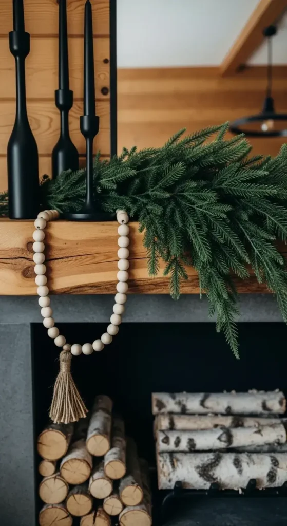 Natural wood elements, like bead garlands or coasters, bring warmth. It’s a moody and organic style that I find very comforting.