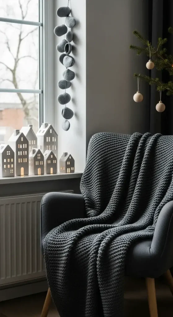 I love using different shades of gray for blankets and pillows. Add pops of clean winter white with ceramic houses or simple ornaments. It’s comforting, minimal, and very chic.