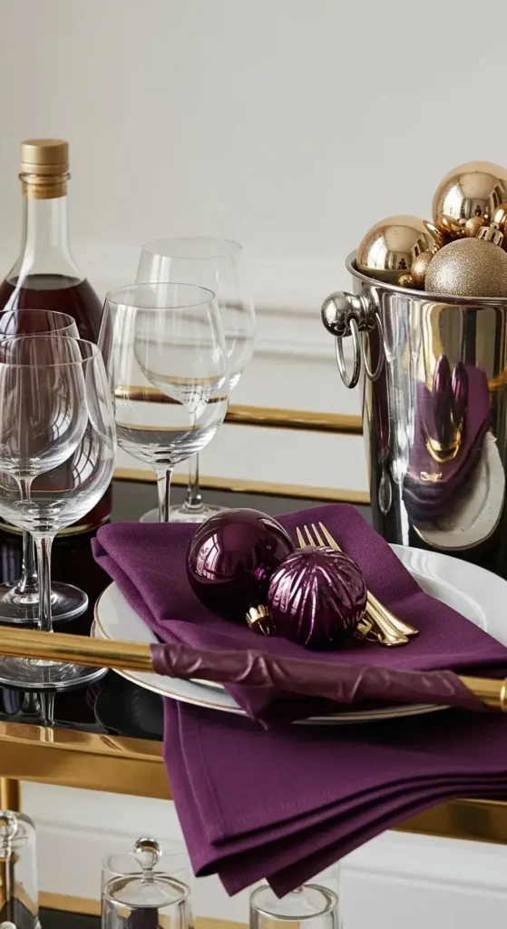 Use plum as your rich accent color. A few deep plum glass ornaments will stand out beautifully on a tree. Then, fill in the rest with shimmering champagne gold and soft cream tones for a balanced look.