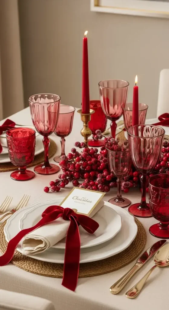 The key is to focus only on rich cranberry red. Pair it with neutral colors like cream, beige, or gold. Cranberry-colored glassware and luxurious velvet ribbons look stunning on their own without green. It feels classic but fresh.