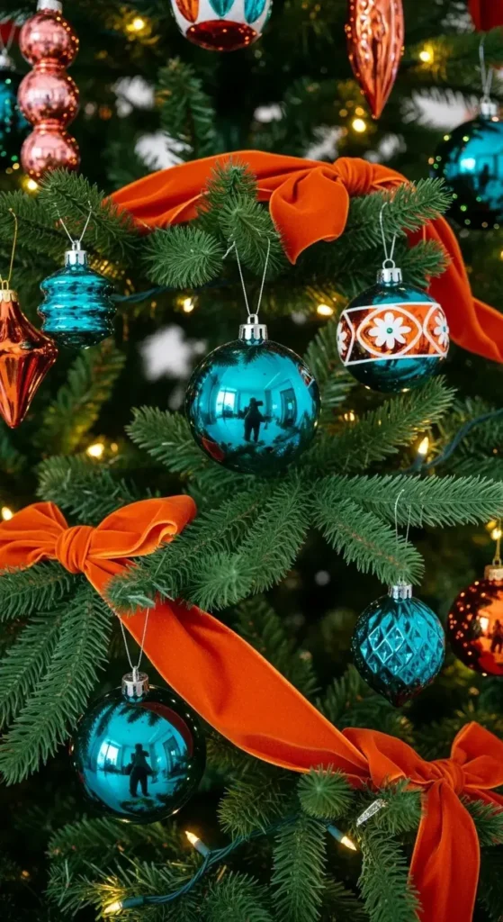 This combination has a very cool, retro vibe that I adore. Deep teal ornaments look stunning against the warm glow of burnt orange velvet ribbons.