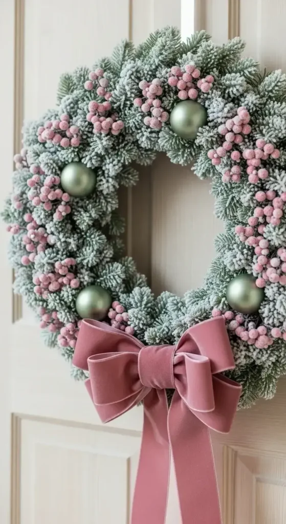 Lean into frosted and matte finishes for your ornaments. A frosted sage green wreath is a perfect starting point. Then, find dusty rose velvet ribbon to hang ornaments or wrap gifts. The different sheens create a beautiful effect.