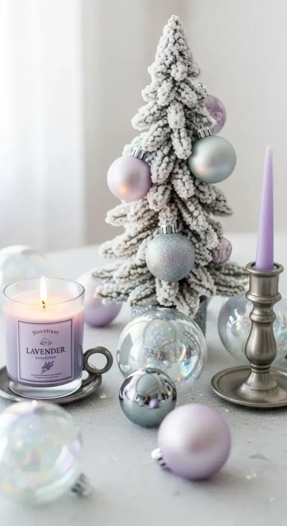 Create a dreamy, frosty look with soft lavender and cool-toned pewter. Lavender-scented candles and light purple ornaments create a sense of calm.