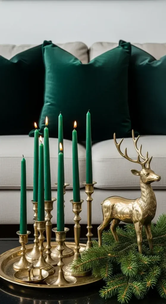 Think emerald green candles in brass holders. Picture green velvet pillows on the sofa. It feels luxurious and absolutely timeless right away.