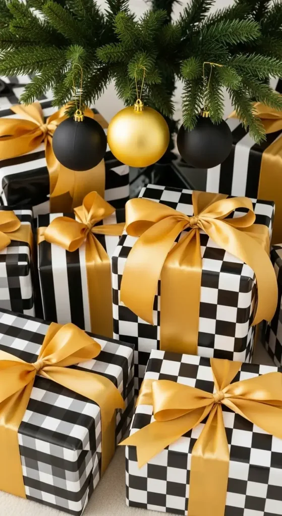 I would choose a theme and stick with it. Maybe it’s bold stripes or a playful polka dot. Use that pattern in your ribbons and gift wrap. Then, go all out with the gold. More is more with this palette!