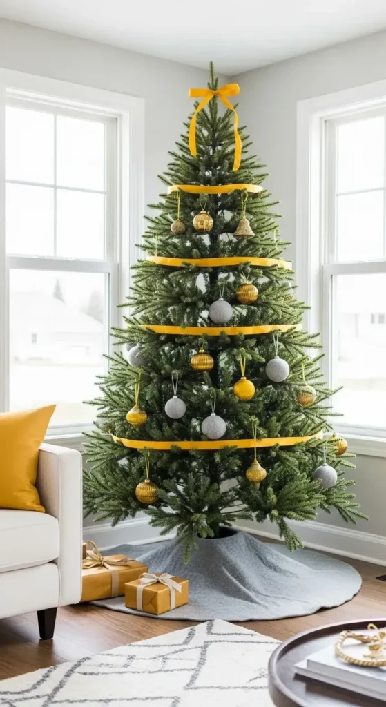 For a cheerful and modern Christmas, try a pop of mustard yellow. Yellow ornaments and ribbons add a splash of sunshine on a cold day.