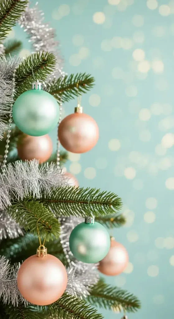 This palette is fresh, light, and wonderfully playful. Soft peach-colored baubles can hang next to cool mint green ones on the tree.