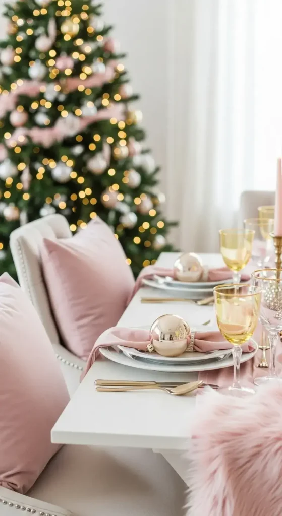 Use lots of warm-toned metallics. I suggest mixing champagne gold with traditional yellow gold for more depth. Add soft textures like blush velvet pillows or a pink faux fur tree skirt. This makes the space feel extra cozy.