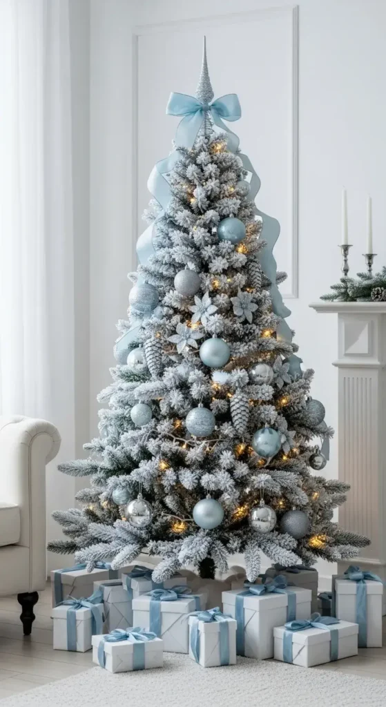 Imagine your room looking like a quiet, snowy morning. This combination is so serene. Light blue ornaments mix with shiny silver ones on the tree.