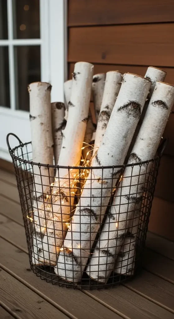 Find a large wicker or wire basket. Fill it with a handful of white birch logs. The bright white bark provides a lovely contrast to evergreens.