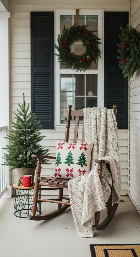Set up a rocking chair with a festive holiday pillow. Add a chunky knit throw blanket for warmth. It’s an open invitation to sit and relax.