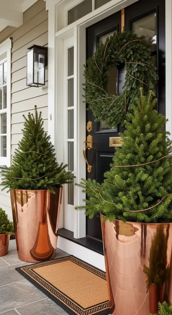Use copper planters to hold your mini porch trees or evergreen arrangements. The metallic finish adds a touch of modern sophistication to your holiday display.