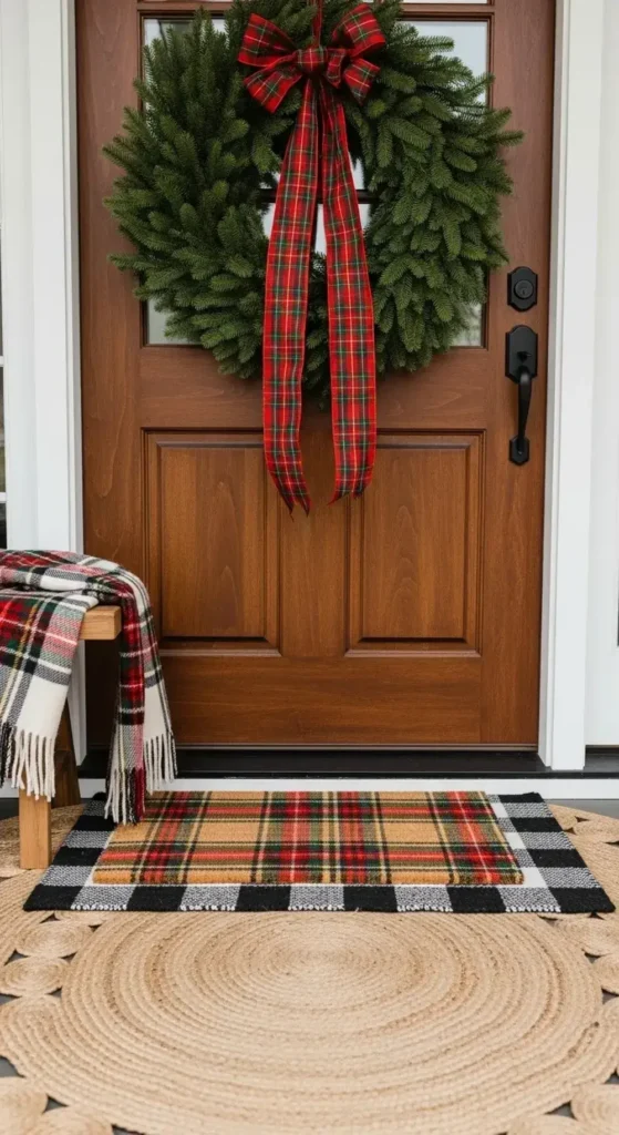 Start with a doormat in a festive tartan print. Then, add a matching plaid ribbon to your evergreen wreath. If you have a bench, drape a soft plaid blanket over it.