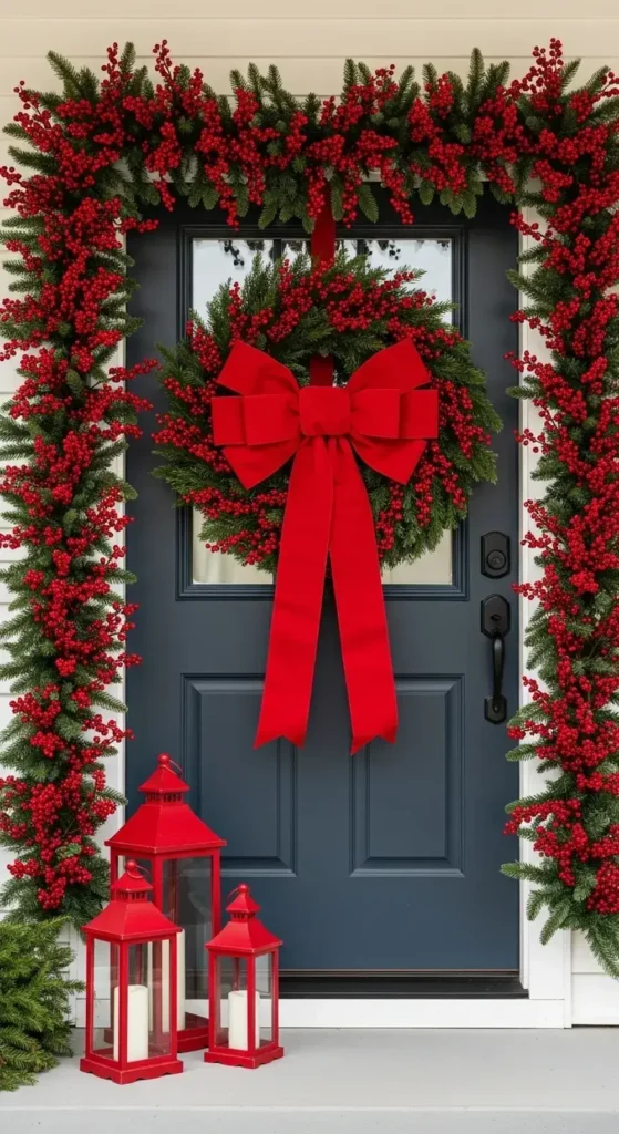 Choose wreaths and garlands that are packed with bright red winterberries. Add a large, vibrant red bow to your front door for a beautiful focal point.