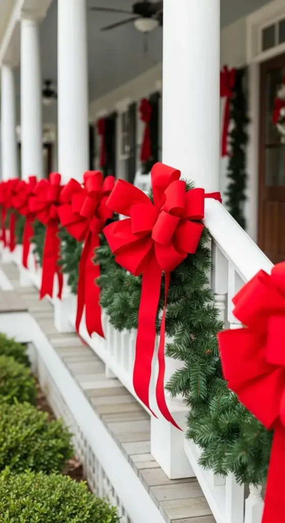 Tie large, beautiful bows along your porch or stair railings. Make sure you use weatherproof ribbon that can withstand the winter elements. It’s an easy festive touch.