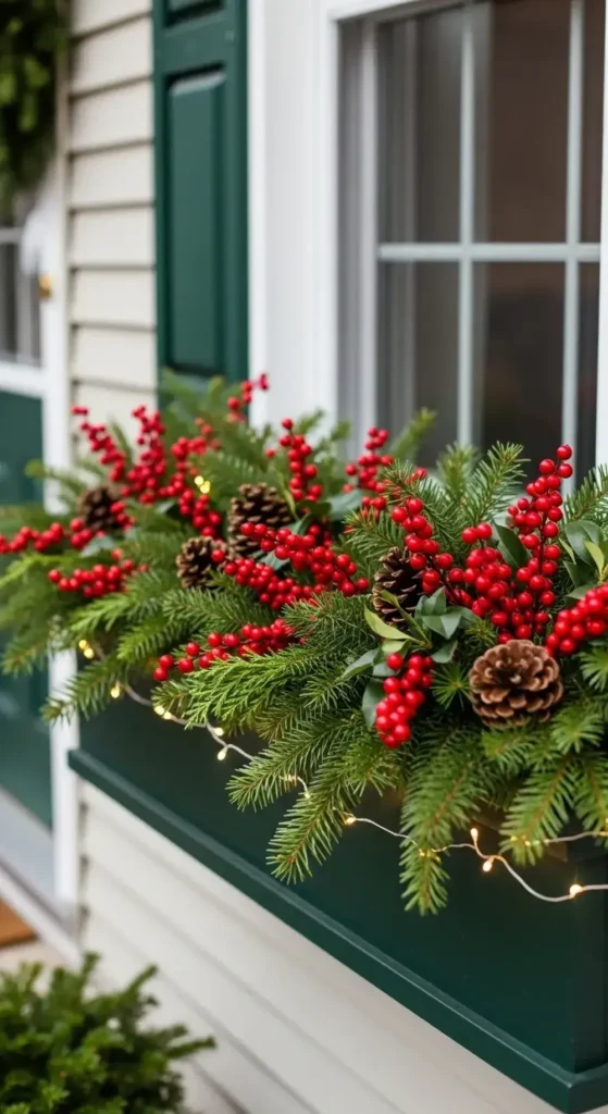 Fill your window boxes with the same elements used on your porch. Add evergreen boughs, pinecones, and colorful winterberries for festive cheer.