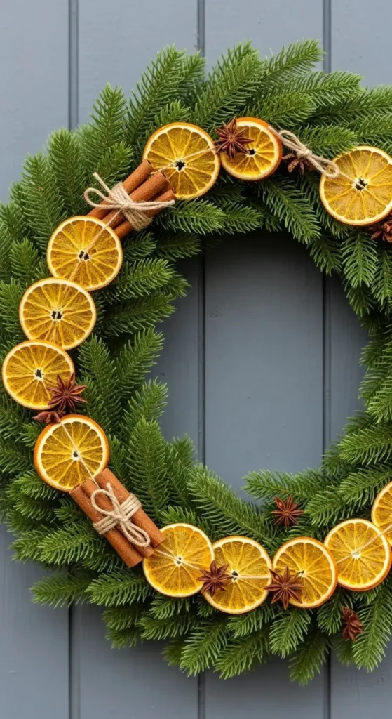 String dried orange slices together to make a simple, lovely garland. You can add them to your wreath along with fragrant cinnamon sticks and star anise.