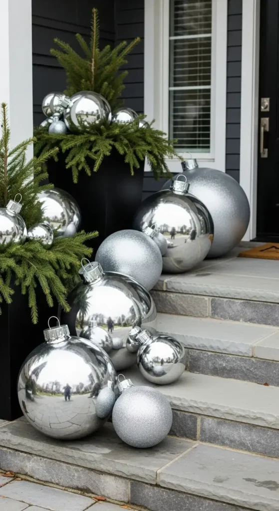 Place a few giant, shatterproof ornaments directly on your porch steps. You can also nestle them in your planters among the greenery for a pop of color.