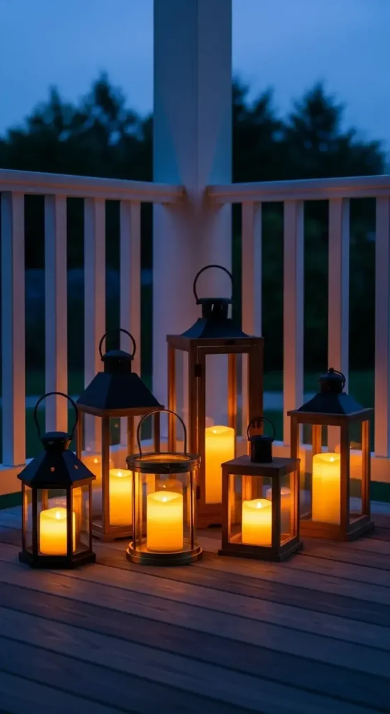 Place a few black or dark gray lanterns on the steps. This minimalist style focuses on form and function. It creates a serene and inviting porch scene.