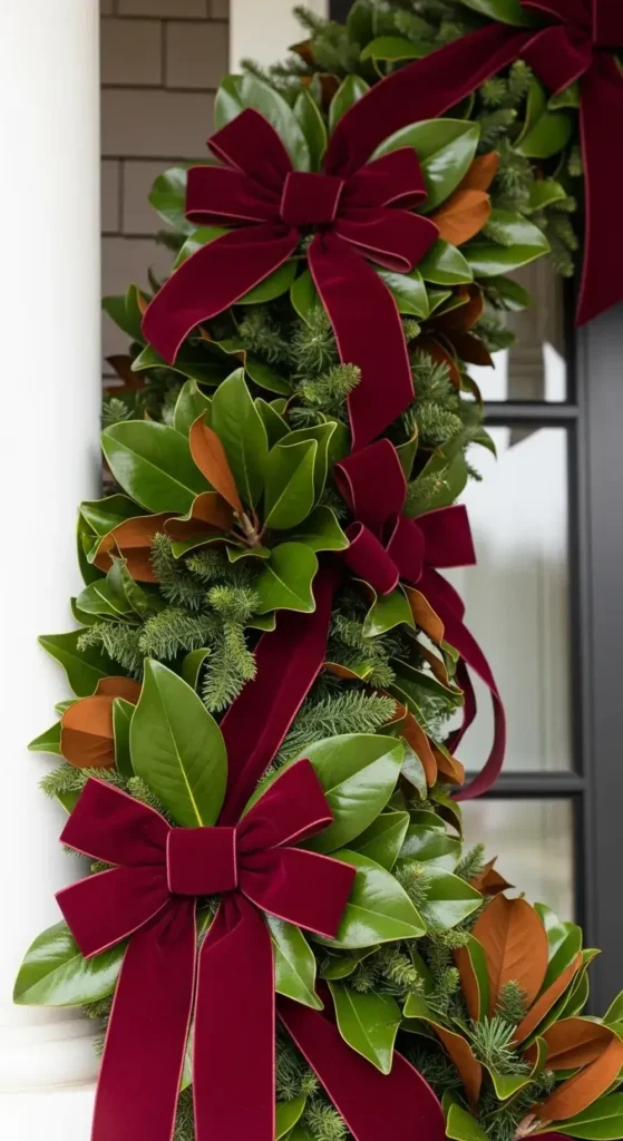 Use a garland made of fresh or faux magnolia leaves. Don’t forget to let the brown velvet undersides show for beautiful contrast. This is a top-tier Christmas front porch idea.
