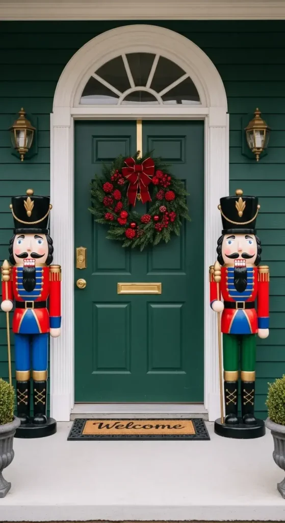 You can find nutcrackers in almost any color scheme now. Choose a pair that complements your wreath and other decorations for a perfectly coordinated entrance.
