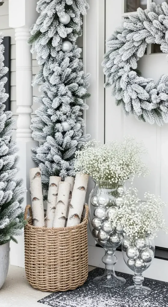 Use flocked wreaths and garlands that are pre-dusted with faux snow. You can place white birch logs in a rustic basket for height. It’s one of my favorite Christmas front porch ideas.