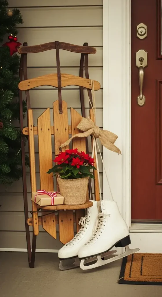 Find an old wooden sled and lean it right next to your door. You can tie a pair of vintage ice skates to the sled with a simple burlap ribbon.