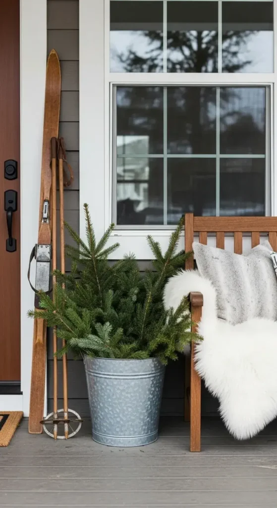 Prop a pair of old wooden skis against the wall next to your door. Fill a vintage-style galvanized metal bucket with fresh evergreen branches and pinecones.