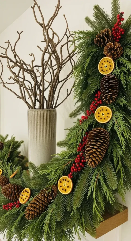 Tuck real pinecones, some fragrant dried orange slices, or small clusters of winterberries directly into your garland.