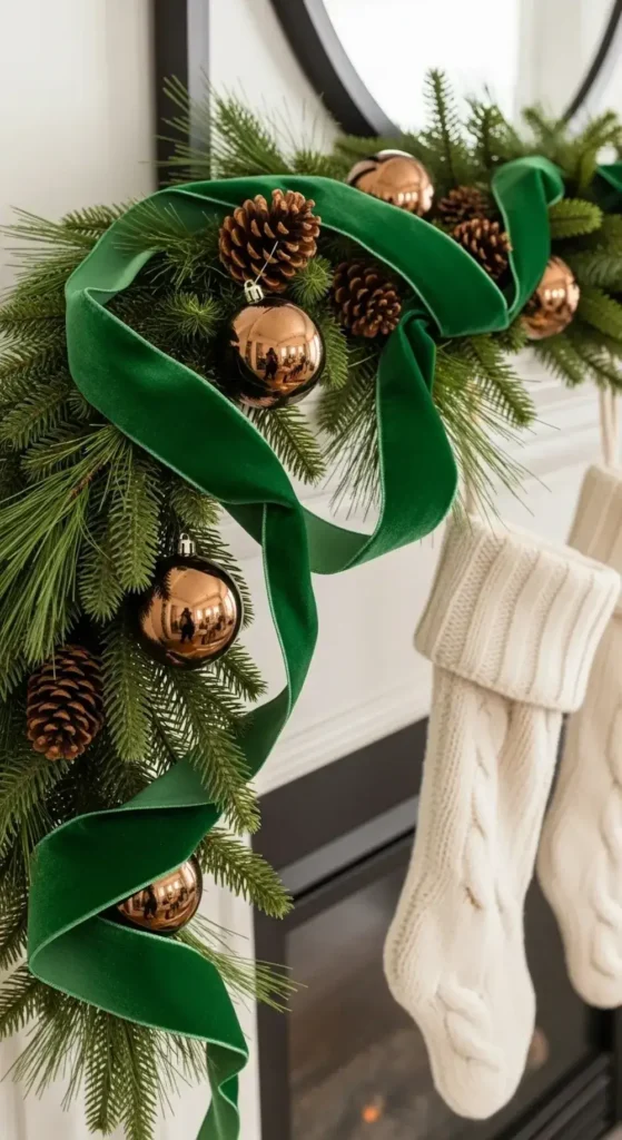 I love weaving a soft, wide velvet ribbon through the prickly needles of a traditional pine garland.