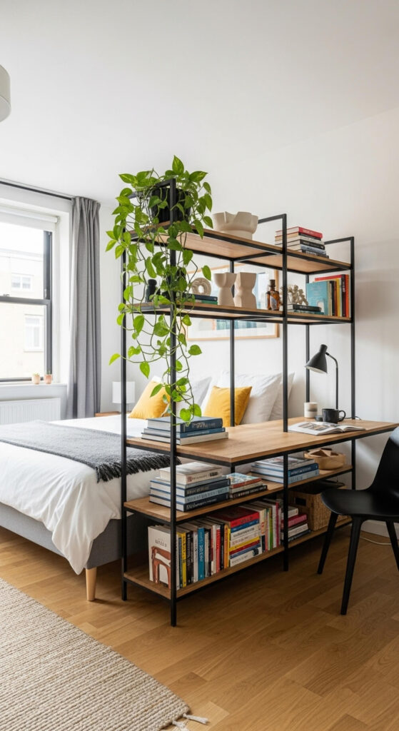 In a studio or open-plan room, use your desk to divide the space. An open-back shelving unit with a desk section can be a great option.