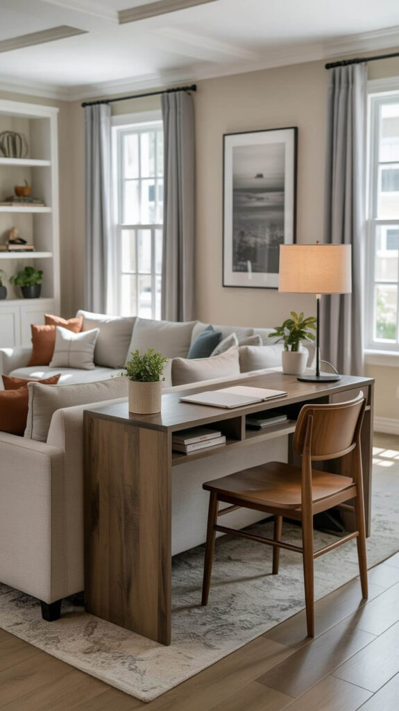 Place a skinny console table or desk directly behind your living room sofa. It blends into the living space while creating a defined work zone.
