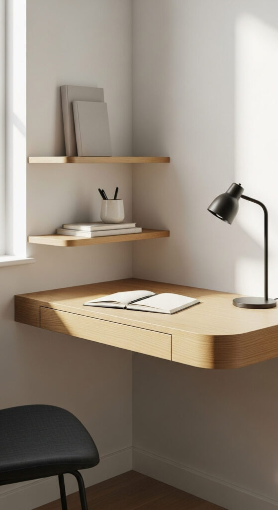 Imagine a clean wooden shelf curving into a corner. There are no legs to clutter the floor. It feels light and breezy.