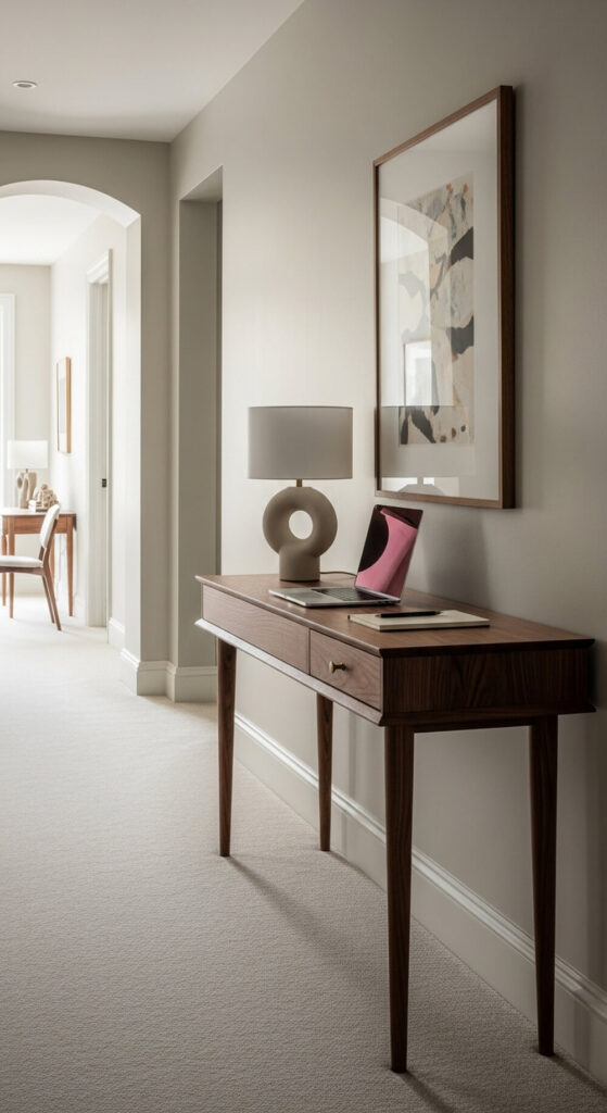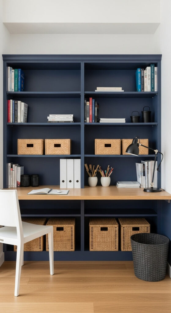 The desk feels intentionally built-in. It turns the whole wall into a functional and stylish feature. This is one of the best small home office layout ideas.