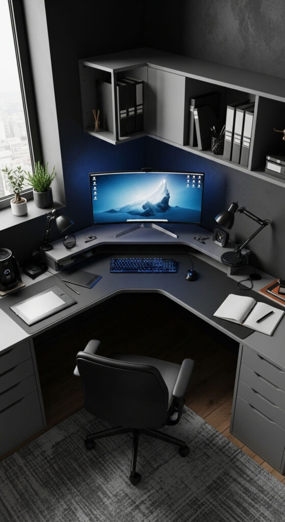 Tuck an L-shaped desk snugly into a corner. This layout often uses wasted corner space. It gives you two distinct work surfaces.