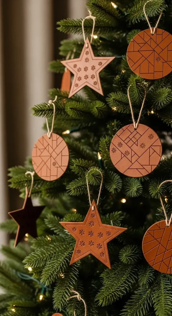 I love the smell and feel of these. The ornaments are simple shapes, like stars or circles. They are cut from a rich, brown leather.