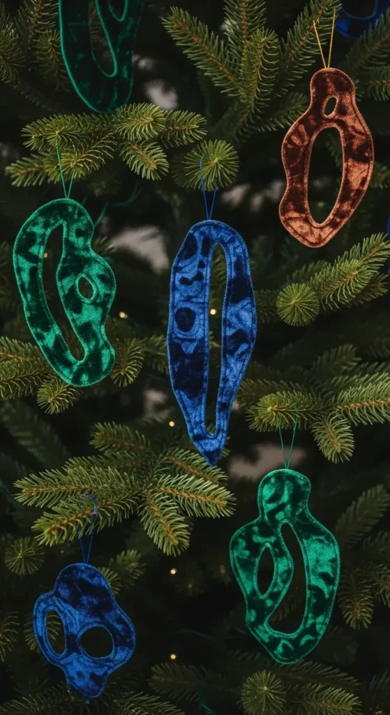 I love them in jewel tones like emerald and sapphire. They look incredibly luxurious and tactile hanging amongst the pine needles.