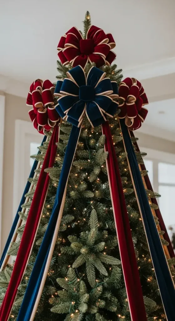 I love them in deep burgundy or navy blue. The long tails of the ribbons drape down gracefully over the top branches. It’s instant elegance.