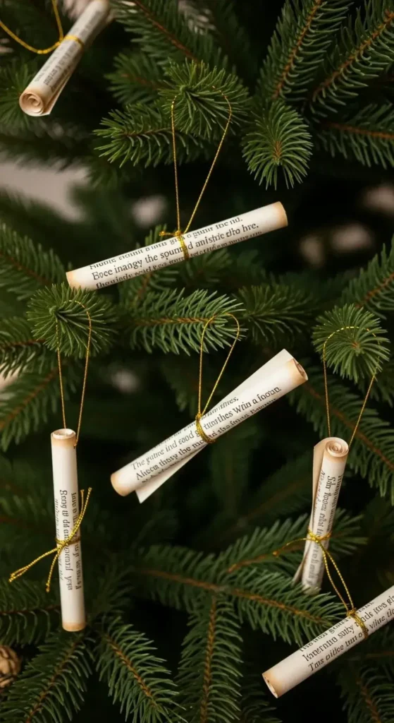 A snippet of a favorite song or poem. Then, tie them with a very thin gold thread. They look like secret messages hanging on your tree.